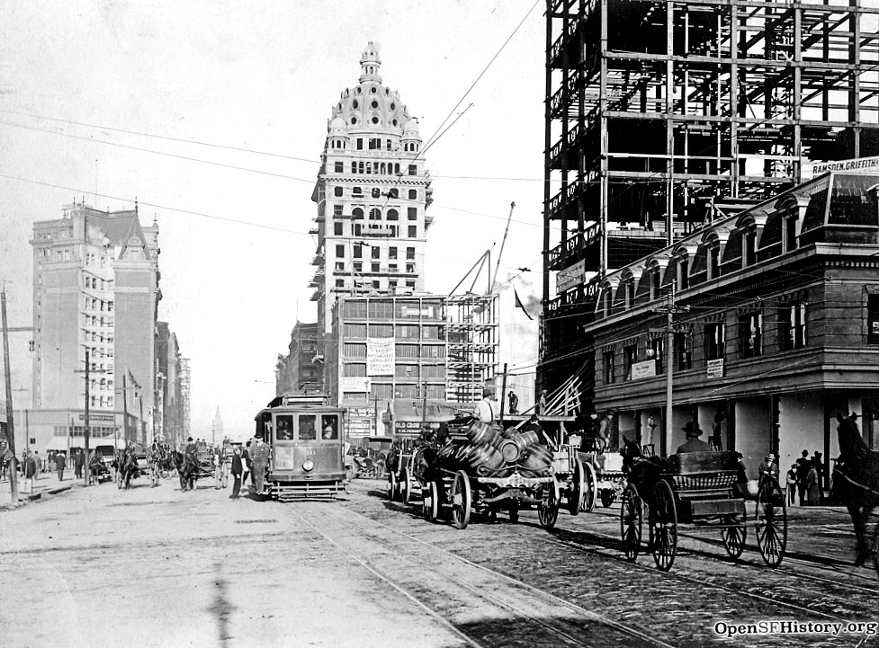 Progress as of October 1907. The Humboldt Building would open in 1908. Thanks to Art Siegel for locating the photo. It's another on the Open SF History Project website. It's by Martin Behrman and is from the Martin Behrman Negative Collection in the archives of the Golden Gate NRA.
