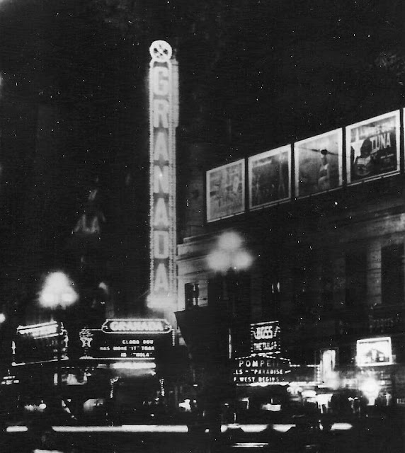 "Footlight Parade" at the Granada. The film played the Paramount in November 1933. The shot was included in a 2018 auction on www.eMoviePoster.com that included many photos of theatre displays. Thanks to Gary Meyer for sending it along and Gary Parks for spotting this one as the Granada. Gary comments: "There's no mistaking the top of the poster case peeking above the display, with its cast bronze head of a woman with a Lady Liberty type crown, and the pair of marquee support corbels over it."