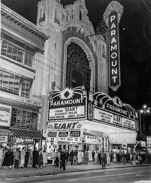 An October 3, 1955 shot by Nat Farbman for Life. Thanks to Jack Tillmany for the date. The Paramount has "Ulysses" with Kirk Douglas" plus a sneak preview that night. The United Artists is running David Lean's "Summertime." The photo appears with Peter Hartlaub's April 14, 2019 Chronicle story "The birth of a Market Street cinema district: Celebrities, crack dens and a coda." Thanks to Bob Ristelhueber for spotting the story.